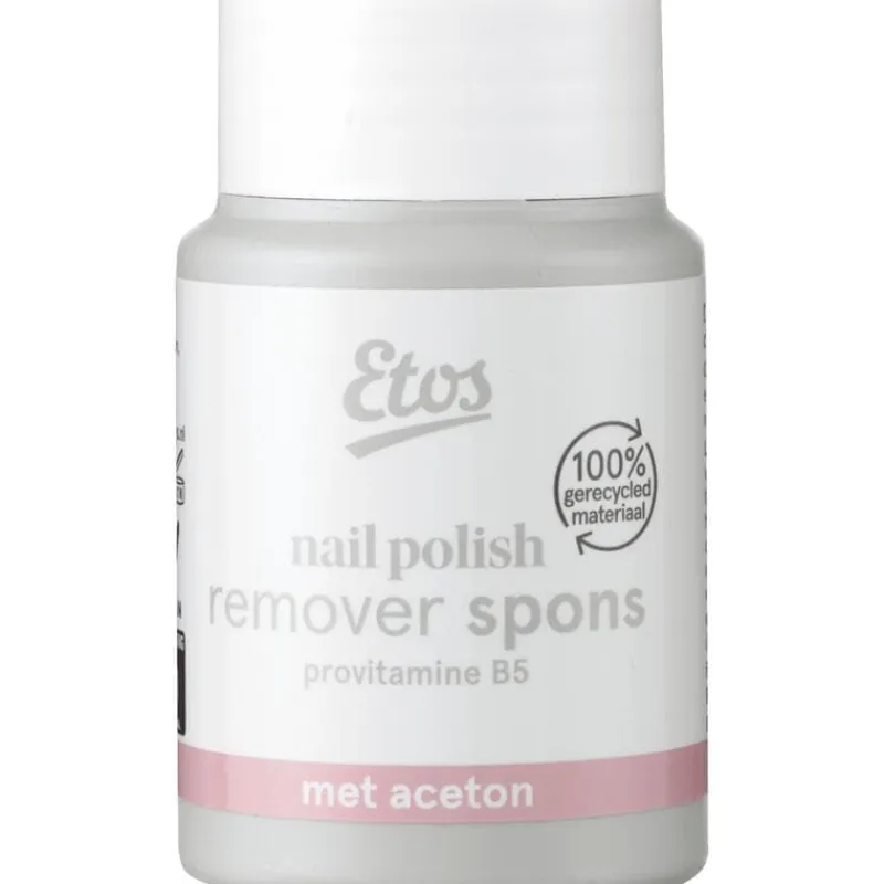 Etos Nail polish remover spons met aceton 75 ml verwijdert moeiteloos nagellak. De nail polish remover spons verwijdert snel en efficiënt alle soorten nagellak, zonder dat je watjes hoeft te gebruiken. De remover bevat provitamine B5 en droogt de nagels niet uit.