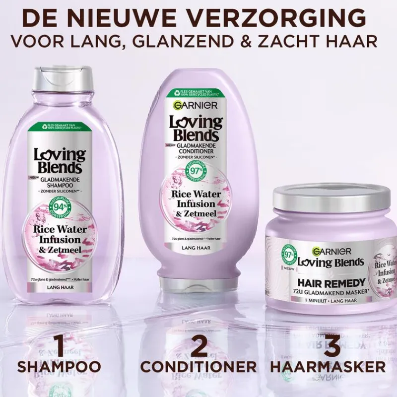 De Loving Blends Rice Water Infusion shampoo van Garnier is een shampoo van 94% natuurlijke oorsprong speciaal ontwikkeld voor lang haar. De shampoo werkt als een remedie om lang haar voller te maken met hydratatie. De haarschubben zijn hersteld waardoor ze weer in staat zijn om licht te reflecteren.