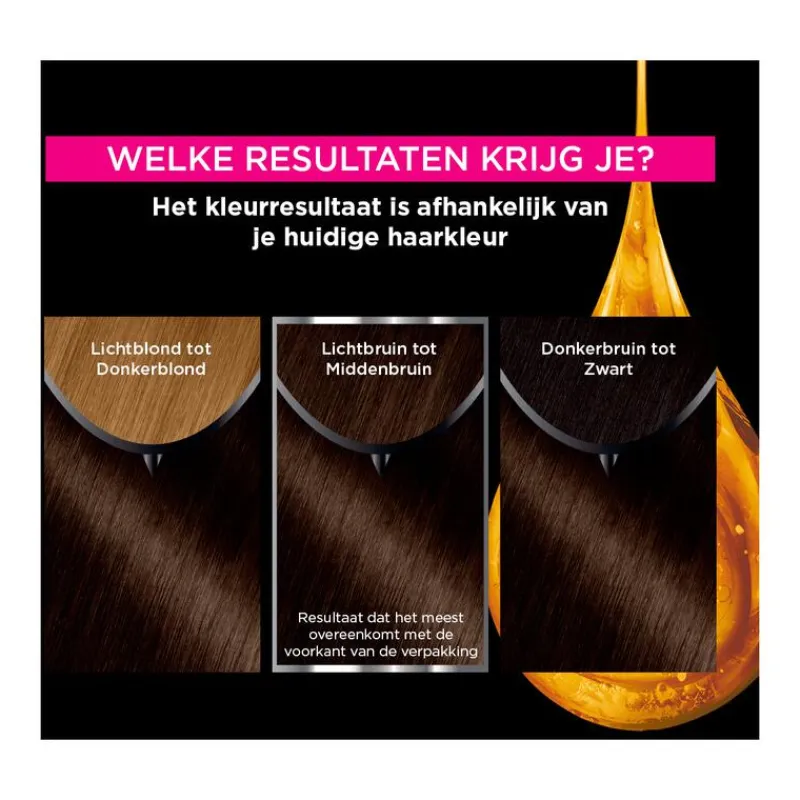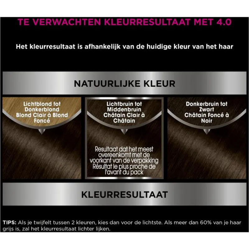 VOORZORGSMAATREGELEN HAARKLEURSTOFFEN KUNNEN ERNSTIGE ALLERGISCHE REACTIES VEROORZAKENLees en volg de instructies.Dit product is niet bestemd voor gebruik bij personen jonger dan 16 jaar.TIJDELIJKE TATOEAGES MET ZWARTE HENNA KUNNEN LEIDEN TOT EEN VERHOOGD RISICO OP EEN ALLERGISCHE REACTIE.Kleur uw haar niet als:• u last heeft van uitslag in het gezicht of van een gevoelige, geïrriteerde of beschadigde hoofdhuid• u eerder een reactie na een haarkleuring heeft gehad• u in het verleden een reactie heeft gehad na een tijdelijke tatoeage met zwarte hennaALLERGIE NEGEREN KAN LEVENSBEDREIGEND ZIJN Het is noodzakelijk een ALLERGIE WAARSCHUWINGSTEST 48 uur vóór iedere haarkleurbehandeling uit te voeren zelfs indien u al eerder een kleurproduct heeft gebruikt.Denk eraan het product 48 uur van te voren te kopen. (lees en volg de gebruiksaanwijzing). Bij een reactie of bij twijfel, raadpleeg een arts voordat u een kleurproduct gebruikt.”De ontwikkelvloeistof’’ bevat waterstofperoxide.“Het kleurproduct”a bevat: fenyleendiaminen, resorcinol, fenyleendiaminen (tolueendiaminen), ammoniak.• Bijgevoegde handschoenen dragen.• Contact van het product met de ogen vermijden. Niet gebruiken voor het kleuren van wimpers of wenkbrauwen. • Bij contact van het product met de ogen onmiddellijk met overvloedig water spoelen • Spoel het haar na de inwerktijd van het product goed uit.Wacht 2 weken na een permanent of een behandeling met een duurzaam gladmakend product.Niet gebruiken als uw haar gekleurd is met henna of een progressieve kleuring. Buiten bereik van kinderen houden.VOLG DE GEBRUIKSAANWIJZING Raadpleeg de ingrediëntenlijst onder dit kader.