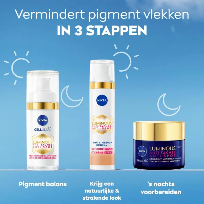 De NIVEA Luminous630® Anti-Spot CC Crème Fluid met SPF 30 perfectioneert je teint dankzij een drievoudige werking. 1. De huidtint aanpassende micro-ingekapselde pigmenten zorgen voor een natuurlijk ogende dekking en egaliseren direct donkere vlekjes en oneffenheden. 2. De formule met luminous630® vermindert zichtbaar pigmentvlekken in 2 weken en egaliseert de teint met + 40% in 8 weken.* 3. De formule met spf30 beschermt tegen de zon en voorkomt dat nieuwe pigmentvlekken opnieuw verschijnen. Een baanbrekende innovatie. Na 10 jaar onderzoek en de screening van meer dan 50.000 ingrediënten hebben NIVEA wetenschappers luminous630® ontdekt. Brengt pigmentatie op celniveau in balans om pigmentvlekken te verminderen en helpt voorkomen dat ze opnieuw verschijnen. *Zelfbeoordeling, 12 weken durend onderzoek bij 51 vrouwen, 2023