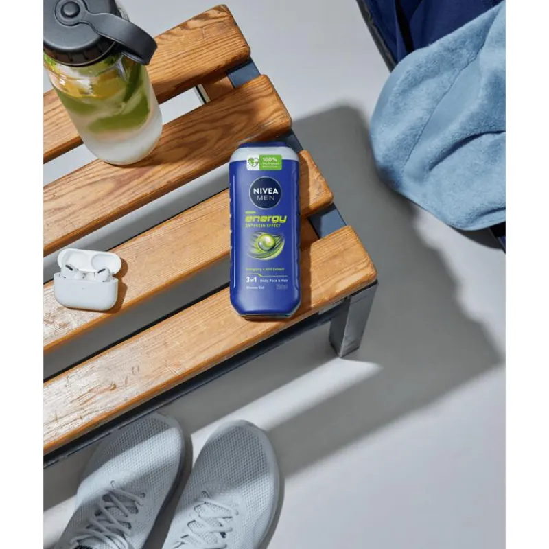 Ervaar een verkwikkende boost met NIVEA MEN Energy Douchegel – speciaal ontwikkeld voor mannen die elke dag fris en energiek willen beginnen. Deze 3-in-1 formule met activerend mintextract reinigt lichaam, gezicht en haar op milde wijze en zorgt voor een intens fris gevoel. De pH-huidneutrale, dermatologisch goedgekeurde formule verzorgt de huid intensief zonder uit te drogen. De frisse mintgeur stimuleert je zintuigen en geeft je lichaam en geest nieuwe energie.