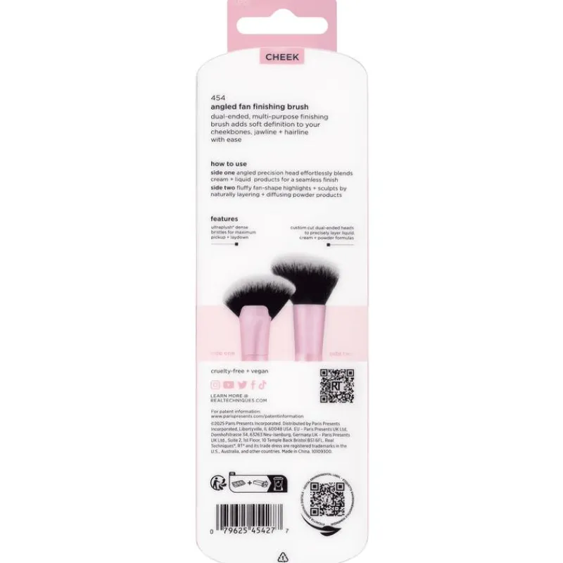 De Angled Fan Finishing Brush is een dubbelzijdige, multifunctionele kwast die met gemak zachte definitie toevoegt aan je jukbeenderen, kaaklijn en haarlijn.Zijde 1 heeft een schuin afgesneden, precieze kop die moeiteloos crème- en vloeibare producten blendt voor een naadloze finish. Zijde 2 is een luchtige, waaiervormige borstel die poederproducten subtiel aanbrengt, opbouwt en vervaagt – perfect voor het highlighten en contouren.De ultra-zachte, dicht op elkaar geplaatste haren zorgen voor maximale opname en egale verdeling van het product. De speciaal gevormde, dubbelzijdige koppen zijn ontworpen om vloeibare, crème- én poederformules nauwkeurig te kunnen aanbrengen.Zoals alle Real Techniques-tools is deze kwast 100% vegan en dierproefvrij.