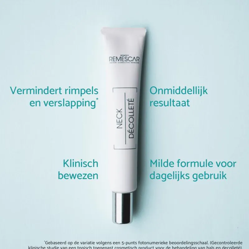 Remescar Hals & Decolleté is speciaal geformuleerd om onmiddelijk de hals decolleté te liften en strakker te maken in slechts 5 minuten. Klinisch bewezen effectief. en met 99% ingrediënten van natuurlijke oorsprong.