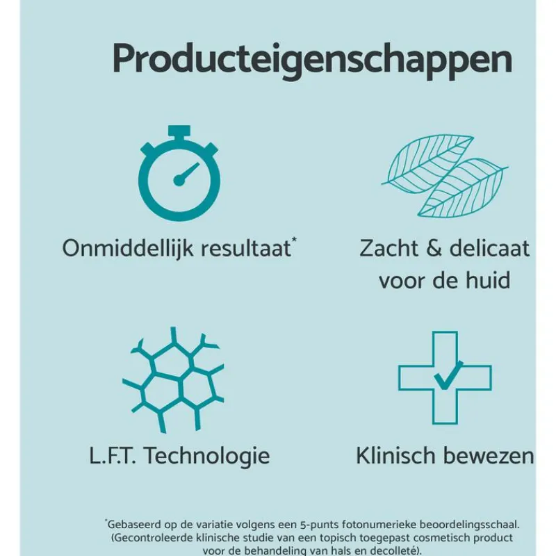 De huid van de hals en het decolleté wordt onmiddellijk verstevigd en gelift dankzij plantaardige tensoren. Deze tensoren zijn een selectie van stoffen die helpen om de huid onmiddellijk te verstrakken en te liften.