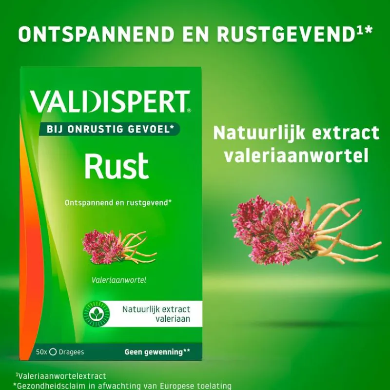 Valdispert Rust is natuurlijk en plantaardig. Het bevat als werkstof een zuiver extract van valeriaanwortel. In de wortel zitten werkzame stoffen met rustgevende eigenschappen.
