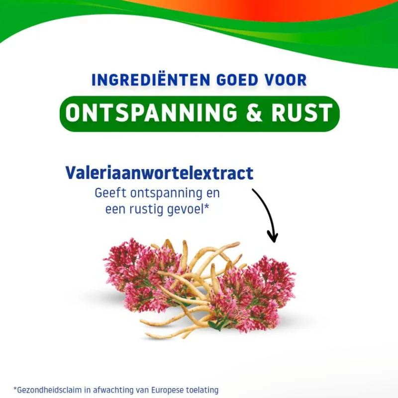 Tijdens spannende tijden en rusteloos gevoel.*¹ Geeft ontspanning en rust.*¹ *Valeriaanwortelextract geeft ontspanning, een rustig gevoel¹. ¹Gezondheidsclaims in afwachting van Europese toelating