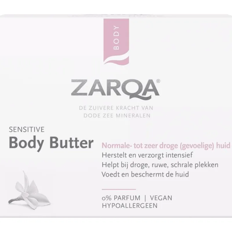 Zarqa Body Butter is een intensief verzorgende crème die de droge, geprikkelde en (zeer) gevoelige huid voedt en beschermt. Ruwe huid, schrale plekken en schilfers worden weer zacht en glad. Het kalmeert de huid en trekkerigheid verdwijnt. Het herstelt de verstoorde vochtbalans en de natuurlijke beschermingslaag van de huid. Verzacht bij kloofjes. Geschikt voor het hele gezin.