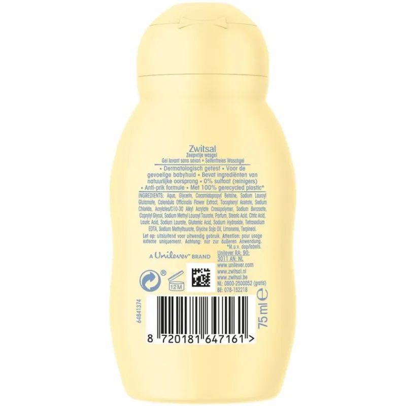 Zwitsal Baby Zeepvrije Wasgel reinigt de babyhuid op milde wijze en helpt de natuurlijke huidbarrière te beschermen. De verzorgende wasgel heeft een vernieuwde formule met de milde Zwitsal-geur en calendula. De wasgel is speciaal ontwikkeld om de gevoelige babyhuid op een zachte en milde manier te reinigen en te verzorgen. Dankzij de anti-prik formule prikt de wasgel niet in de oogjes, wat het badderen een stuk aangenamer maakt. Zwitsal is geschikt voor de gevoelige babyhuid, vanaf de geboorte. Alle Zwitsal-producten hebben de milde, vertrouwde geur van Zwitsal.