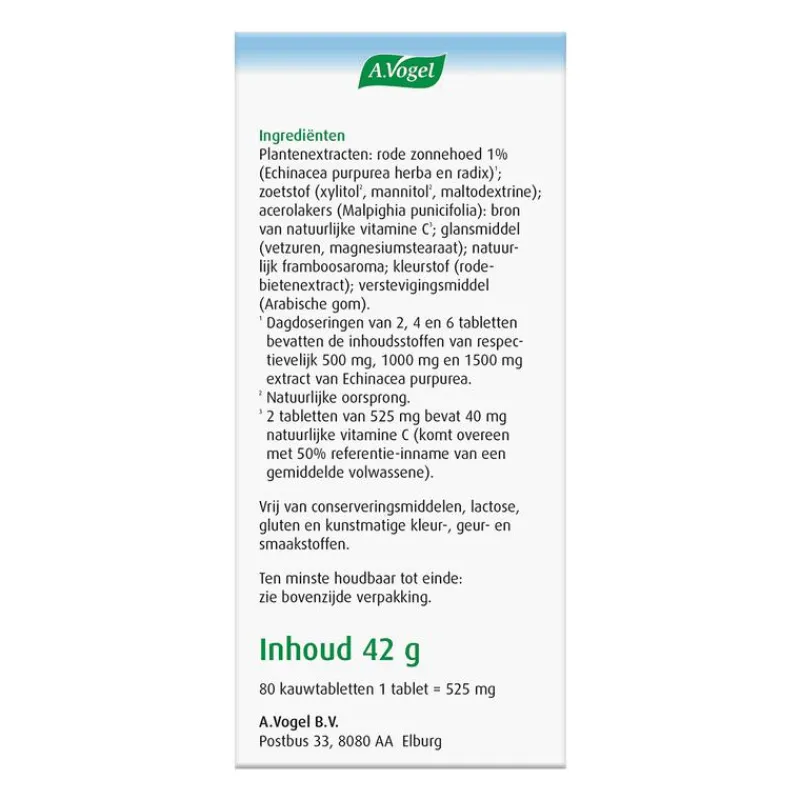 Plantenextracten: rode zonnehoed (Echinacea purpurea herba en radix); vulstof (xylitol, mannitol, maltodextrine); acerolakers (Malpighia punicifolia): bron van natuurlijke vitamine C; glansmiddel (vetzuren, magnesiumstearaat); natuurlijk frambozenaroma; kleurstof (rodebietenextract); verstevigingsmiddel (Arabische gom).