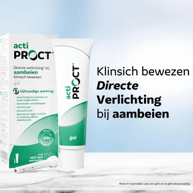 ActiProct® Gel is klinisch bewezen dat het ongemakken bij aambeien verlicht door jeuk en pijn te verzachten en ontstekingen te verminderen. Het geeft een snel verkoelend effect binnen 60 seconden.