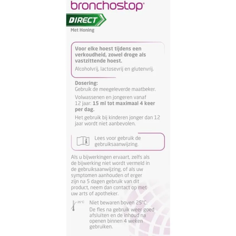 Bronchostop DIRECT met Honing is geschikt voor volwassenen en kinderen vanaf 12 jaar. Vinden kinderen of volwassenen de hoestdrank lastig om in te nemen? Meng het dan met water of los het op in een kop thee. Volwassenen en jongeren vanaf 12 jaar: 15 ml per keer, iedere 3 tot 4 uur. Maximaal 4 keer per dag