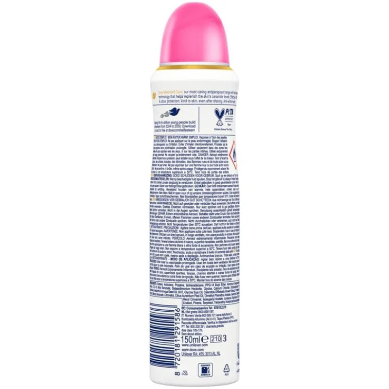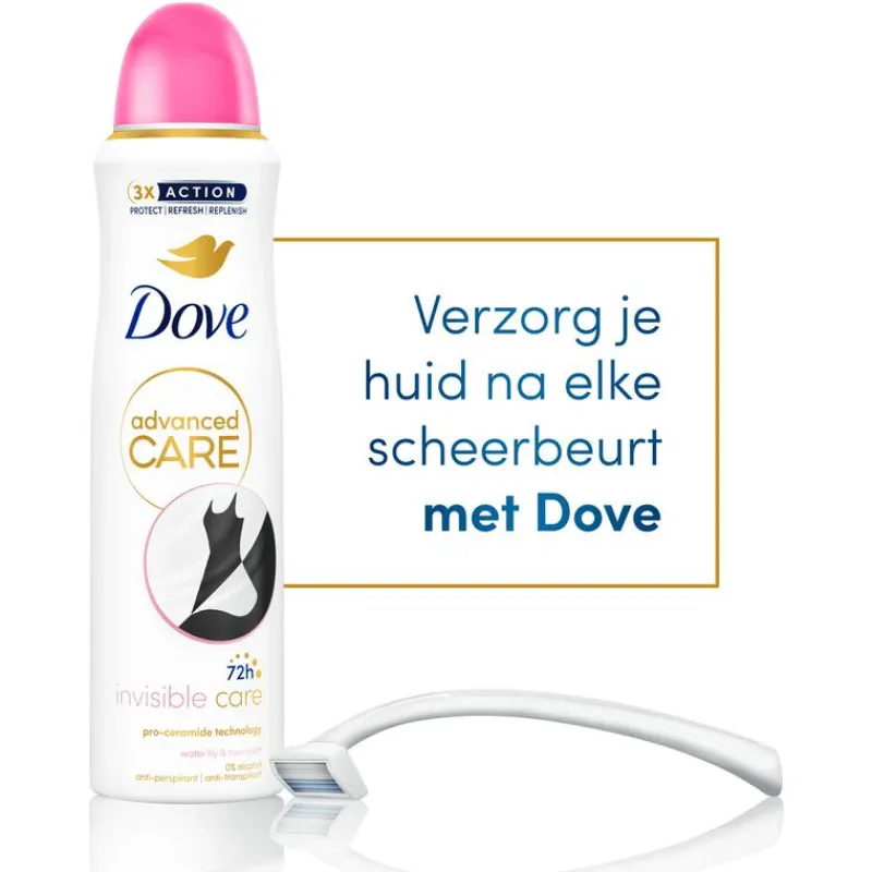 Dove Advanced Care Invisible Care Anti-Transpirant Deodorant Spray met de lekkere geur van waterlelie en rozen beschermt tegen zweet, laat geen witte strepen na op kleding én is lief voor je oksels. Het Advanced Care assortiment van Dove met de verbeterde formule met Pro-Ceramide serum maakt deel uit van de meest verzorgende lijn van Dove. De spray biedt onmiddellijke verlichting na het scheren, helpt de okselhuid te herstellen en beschermt tot 72 uur tegen zweet en lichaamsgeur. Bovendien bevat deze milde formule 0% alcohol. De hele dag een fris en verzorgd gevoel – wat de dag je ook brengt!