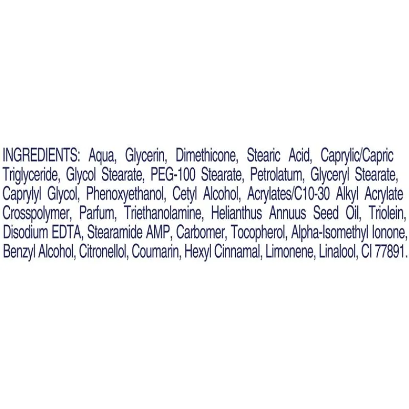 Aqua, Glycerin, Dimethicone, Stearic Acid, Caprylic/Capric Triglyceride, Glycol Stearate, PEG-100 Stearate, Petrolatum, Glyceryl Stearate, Caprylyl Glycol, Phenoxyethanol, Cetyl Alcohol, Acrylates/C10-30 Alkyl Acrylate Crosspolymer, Parfum, Triethanolamine, Helianthus Annuus Seed Oil, Triolein, Disodium EDTA, Stearamide AMP, Carbomer, Tocopherol, Alpha-Isomethyl Ionone, Benzyl Alcohol, Citronellol, Coumarin, Hexyl Cinnamal, Limonene, Linalool, CI 77891.