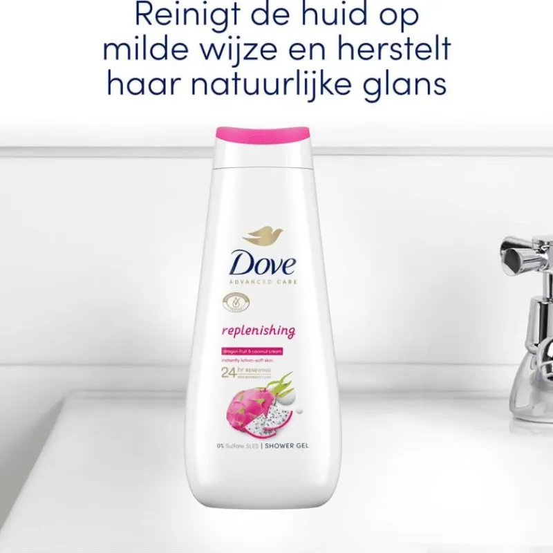 Dove Advanced Care Replenishing Douchegel verandert je dagelijkse douche- of badroutine in een echt verwenmomentje. Dove Replenishing Douchegel heeft een lichte geltextuur en is verrijkt met huidverzorgende voedende bestanddelen. De bodywash reinigt op milde wijze, hydrateert je huid en helpt om haar natuurlijke glans te herstellen met vitaminerijk dragonfruit en voedende kokoscrème. De douchegel bevat de 24-uur vernieuwende MicroMoisture-formule voor een 24 uur lang gehydrateerde, zijdezachte huid. Deze voedende douchegel is gemaakt met natuurlijke milde reinigers en plantaardige moisturisers en is zacht voor het microbioom. De douchegel bevat geen sulfaatreinigers, is voor 94% biologisch afbreekbaar* en is verpakt in 100% gerecyclede plastic flessen**. Dove Replenishing Douchegel heeft een veganistische formule en is door PETA gecertificeerd als ‘vegan’. *94% van de ingrediënten breekt af in kooldioxide, water en mineralen (OECD-testmethoden 301, 302, 310).