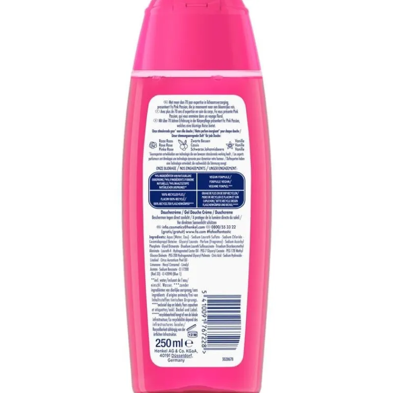 Ontdek Fa Pink Passion douchegel met de geur van roze rozen. De vegan formule bevat 95% ingrediënten van natuurlijke oorsprong (incl. water).