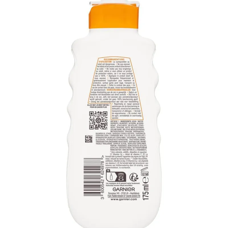 Bescherm en verzorg je huid tegelijkertijd met de Garnier Ambre Solaire hydraterende zonnebrandcrème SPF 30 in reisformaat. Deze beschermende zonnemelk is verrijkt met vitamine C*, hydrateert 24 uur en helpt de tekenen van huidveroudering door de zon te voorkomen. Water-, zweet- en zandbestendig. Trekt snel in, plakt niet, voelt niet vet en laat geen witte waas achter. *Vitamine Cg, een afgeleide van vitamine C Hoe te gebruiken: Breng het zonnebrandproduct aan vlak voor blootstelling aan de zon. Regelmatig en royaal opnieuw aanbrengen om de bescherming te behouden, vooral na het zwemmen, transpireren of afdrogen. Overmatige blootstelling aan de zon is gevaarlijk. Baby’s en kinderen niet blootstellen aan direct zonlicht. Blijf niet te lang in de zon, zelfs niet wanneer een zonnebrandproduct wordt gebruikt, omdat het géén 100% bescherming geeft. Vermijd de oogcontouren. Bij contact met de ogen, onmiddellijk en overvloeding spoelen.
