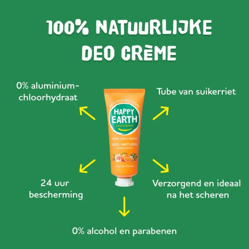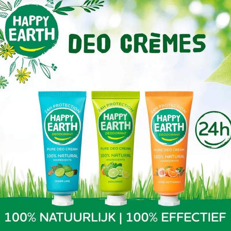 Alle HAPPY EARTH deodoranten zijn 100% natuurlijk, vrij van aluminiumzouten, duurzaam verpakt en in Nederland geproduceerd.