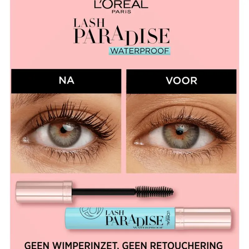 Het unieke mascaraborsteltje is ultrazacht en heeft holle vezels waardoor je in één applicatie de juiste hoeveelheid formule op de wimpers aanbrengt. Daarnaast verzorgt de castorolie de wimpers voor een luxe ervaring! De met castorolie verrijkte waterproof L’Oréal mascara accentueert de ogen door de wimpers te verlengen en meer zichtbaar volume te geven. De paradise mascara is opbouwbaar zodat er meerdere lagen waterproof volume mascara aangebracht kan worden om een unieke look te creëren. Paradise Extatic Waterproof mascara heeft een nieuwe naam (Lash Paradise Mascara), een nieuwe look en dezelfde, vertrouwde formule die je gewend bent. Met de Lash Paradise Waterproof Mascara geef je de wimpers direct fenomenaal volume.