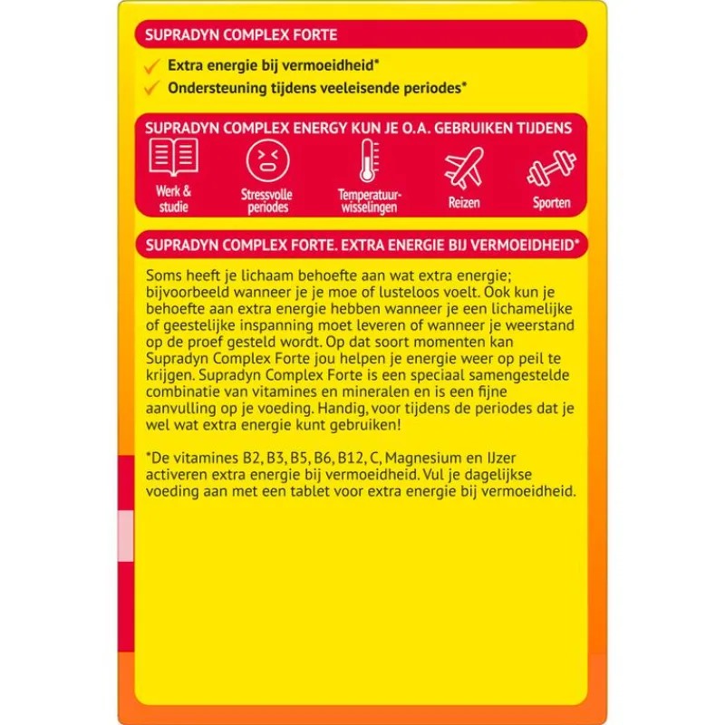 Sta actief in het leven! Supradyn Complex Forte geeft je als aanvulling op de voeding een steuntje in de rug tijdens veeleisende periodes waarin je de extra energie bij vermoeidheid goed kunt gebruiken**, zoals drukte op je werk, als je weerstand op de proef wordt gesteld, de combinatie werk/gezin. Neem als aanvulling op je dagelijkse voeding een hoog gedoseerde tablet van Supradyn Complex Forte. ; *De vitamines B2, B3, B5, B6, B12, C, het mineraal magnesium en het sporenelement ijzer activeren extra energie bij vermoeidheid. ; **Multiscope marktpeiler 2016 ; ***Vergeleken met Supradyn Complex Energy; ruim onder de maximaal veilige hoeveelheid.