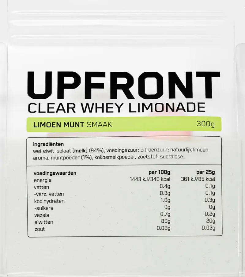 Op zoek naar een lichte, verfrissende eiwitbron? De Upfront Clear Whey Limonade in limoen-munt smaak met maar liefst 19g eiwit per shake is perfect voor na je training of als verantwoorde dorstlesser.