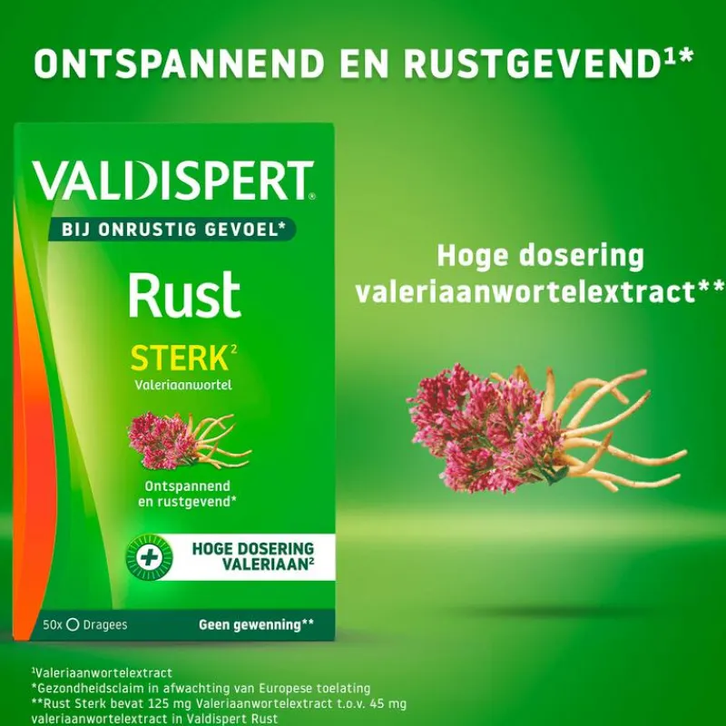 Valdispert Rust Extra Sterk is op basis van een natuurlijk, plantaardig en zuiver extract van valeriaanwortel. (Valeriana officinalis) In de wortel zitten werkzame stoffen met rustgevende eigenschappen.DE VOORDELEN VAN VALDISPERT RUST STERK:• Ontspannend en rustgevend*• Bij onrustig gevoel*, spanning, stressmomenten en geestelijke inspanning*• Geeft geen gewenning, is veilig in gebruik zolang je de gebruiksaanwijzing volgt• Bevat geen conserveermiddelen• Vrij van geur- en smaakstoffen*gezondheidsclaim in afwachting van Europese toelatingGEBRUIK:Dosering: 3x per dag 2 dragees innemen. De aanbevolen dosering niet overschrijden. Slik de dragee in z’n geheel door, bijvoorbeeld met water. Valdispert Rust Sterk kan regelmatig en gedurende langere tijd gebruikt worden.Niet geschikt voor kinderen onder de 12 jaar. Dit is een voedingssupplement. Zorg voor gevarieerde, evenwichtige voeding en een gezonde levensstijl: een supplement is een aanvulling, geen vervanging. Houd het middel buiten bereik van kinderen. Geschikt voor vegetariërs.