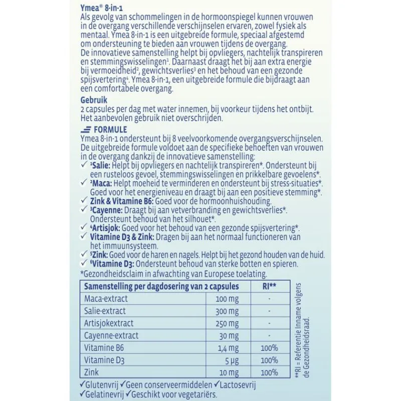 Ymea 8-1 overgangstabletten ondersteunt bij wel 8 veelvoorkomende overgangsverschijnselen. Als gevolg van schommelingen in de hormoonspiegel kunnen vrouwen in de overgang verschillende verschijnselen ervaren, zowel fysiek als mentaal. Ymea 8-in-1 is een uitgebreide formule, speciaal afgestemd om ondersteuning te bieden aan vrouwen tijdens de overgang. De innovatieve samenstelling helpt bij opvliegers, nachtelijk transpireren en stemmingswisselingen¹. Daarnaast draagt het bij aan extra energie bij vermoeidheid², gewichtsverlies³ en het behoud van een gezonde spijsvertering⁴. Ymea 8-in-1, een uitgebreide formule die bijdraagt aan een comfortabele overgang.Ymea 8-in-1 helpt bij 8 veelvoorkomende overgangsverschijnselen.