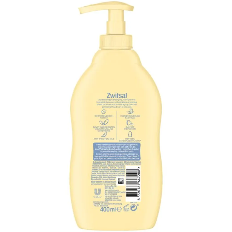 ZwitsalZeepvrije Wasgel deze verzorgende wasgel met calendula reinigt de babyhuid op milde wijze Baby helpt de natuurlijke huidbarrière te beschermen 400 ml