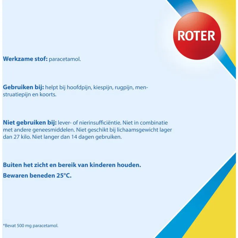 Roter Smelt Paracetamol 500 mg vermindert de pijn bij bijvoorbeeld hoofdpijn, rugpijn, kiespijn, menstruatiepijn, koorts of bij een koortsaanval. Tevens handig voor onderweg, omdat je geen water nodig hebt. Paracetamol is de meest gebruikte en meest bekende pijnstiller.