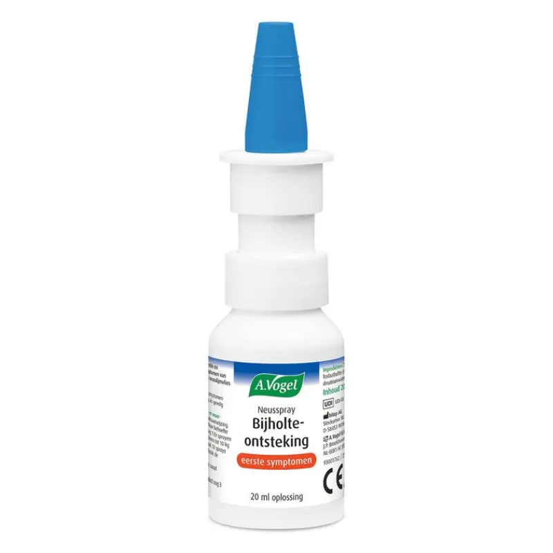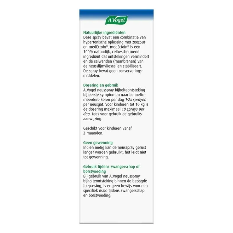 A.Vogel neusspray bijholteontsteking bij eerste symptomen is een hypertone zoutoplossing met medEctoin®.medEctoin ® is een natuurlijk ingrediënt dat de neusslijmvliescellen beschermt, membraan-stabiliserend is en ontstekingen vermindert. Deze neusspray voorkomt en behandelt bijholteontsteking, opent de neus en sinussen, en verlicht symptomen zoals niezen, jeuk en korstvorming. Dit product is klinisch bewezen effectief.