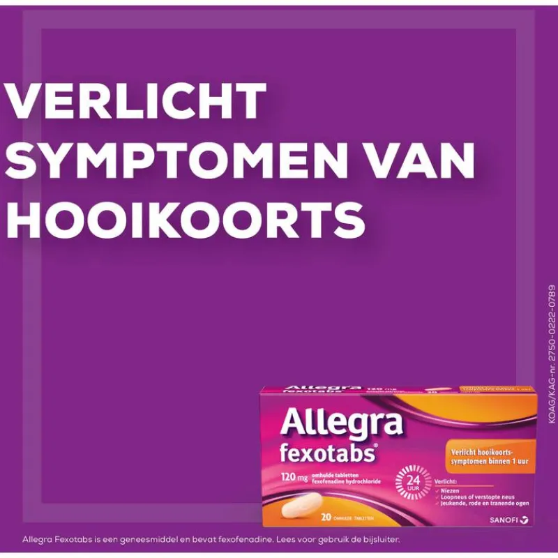 Allegra Fexotabs verlicht de symptomen van hooikoorts (seizoensgebonden allergische rhinitis), zoals niezen, jeuk, loopneus of verstopte neus en jeukende, rode en tranende ogen. Dit medicijn verlicht uw klachten binnen 1 uur en houdt 24 uur aan.
