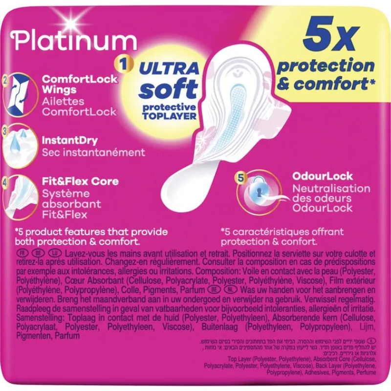 Always Platinum maandverband met ComfortLock vleugels is ontworpen voor een betere pasvorm* om lekken te voorkomen, op zijn plaats te blijven zitten en optimaal comfort te bieden.