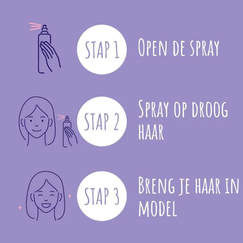 De fles goed schudden voor gebruik. Breng de droogshampoo aan op droog haar en spuit op ca. 20 cm afstand de droogshampoo op de haaraanzet. Laat de spray 2 minuten inwerken en borstel het uit of föhn je haar. Breng je haar vervolgens in model met je handen en creëer je eigen nonchalante look.Gebruik voor een optimaal resultaat ook de andere producten uit de Andrélon Verrassend Volume-lijn.