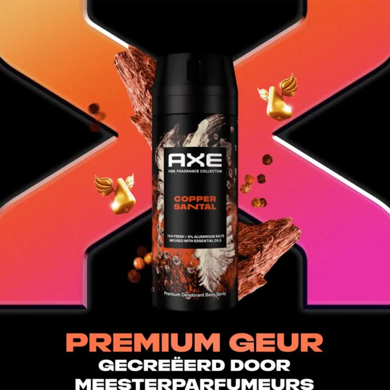Breng fris blijven naar een hoger niveau. Leef dat dagelijkse frisse leven. Je weet nooit wat er kan gebeuren, dus heb je een deodorant bodyspray nodig die ervoor zorgt dat je de hele dag heerlijk ruikt, elke dag weer. Met AXE Fine Fragrance Collection Copper Santal Premium Deodorant Bodyspray ruik je onweerstaanbaar. Deze bodyspray met de onweerstaanbare geur van sandelhout, bruine suiker en zwarte peper is net zo fris als een luxe parfum! En AXE Copper Santal Deodorant Bodyspray beschermt je daarbij ook nog eens 72 uur lang tegen ongewenste lichaamsgeur. AXE Copper Santal Premium Deodorant Bodyspray is een van de premium geuren uit onze AXE Fine Fragrance Collection-lijn. Dit assortiment, met natuurlijke essentiële oliën en 2 keer meer geurbestrijdende zink-technologie dan onze standaard deodorant bodyspray, is gecreëerd door meesterparfumeurs. Met deze Premium Deodorant Bodysprays ruik je net zo onweerstaanbaar als met een luxe parfum, terwijl je tegelijkertijd de bescherming hebt van een deo.