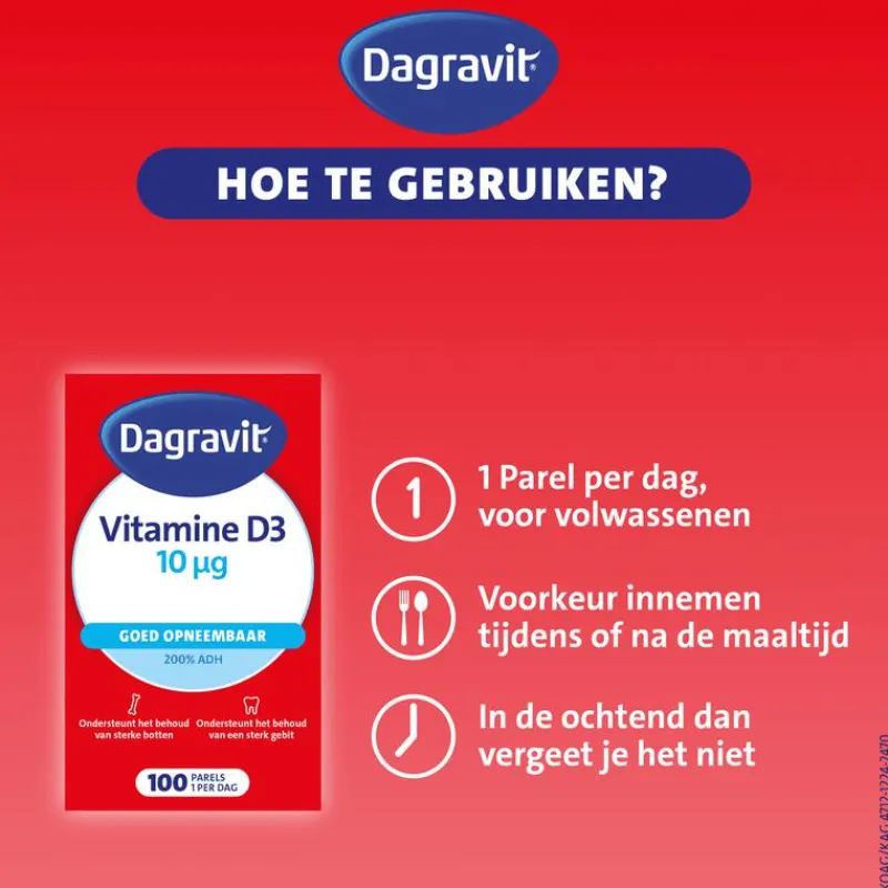 Gebruiksaanwijzing en aanbevolen gebruik per dag: Elke dag 1 parel met water innemen, bij voorkeur tijdens de maaltijd. De Gezondheidsraad adviseert ouderen om dagelijks de volgende hoeveelheid extra vitamine D in te nemen:- vrouwen vanaf 50 jaar: 10 μg – voor mensen die weinig buiten komen of mensen met een donkere huid: 10 μg – vrouwen en mannen tot 70 jaar: 10 μg – vrouwen en mannen vanaf 70 jaar: 20 μg. De aanbevolen dagelijkse dosering niet overschrijden. De aanbevolen dagelijkse dosering niet overschrijden.Dagravit Vitamine D bevat geen conserveermiddelen, geur- en smaakstoffen en is halal.