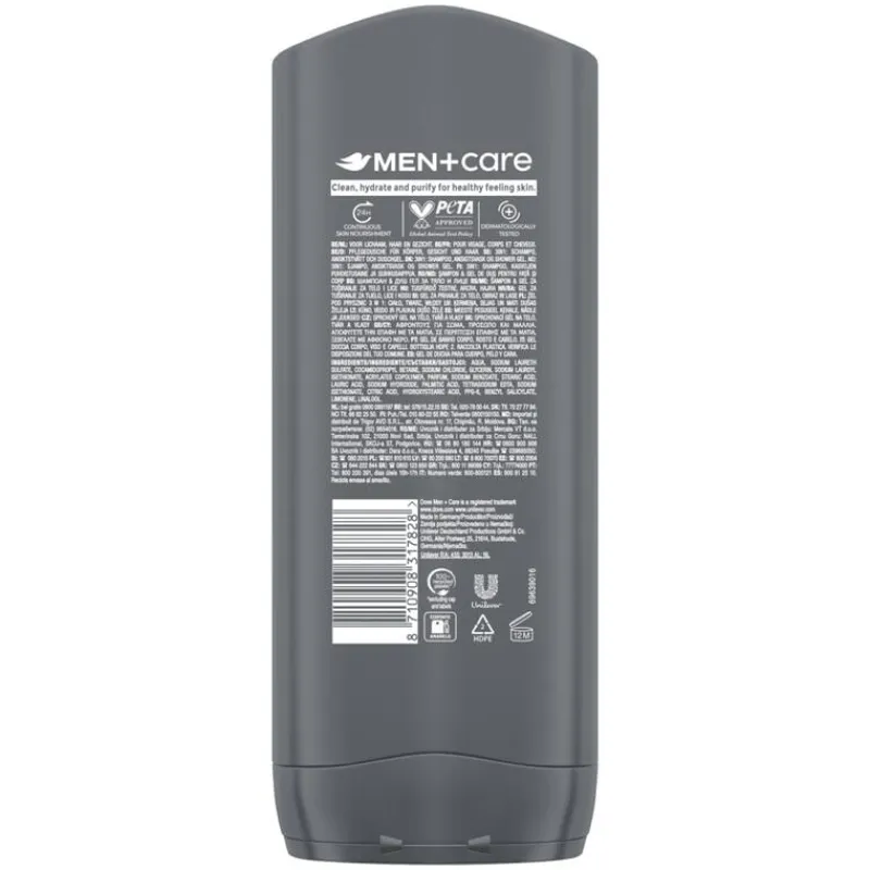 Dove Men+Care wil bijdragen aan een betere wereld. Dove Men+Care 3-in-1 Douchegel wordt verpakt in 100% gerecyclede plastic flessen*. Dove Men+Care test wereldwijd niet op dieren en is door PETA gecertificeerd als ‘Cruelty-Free’. * M.u.v. de dop.