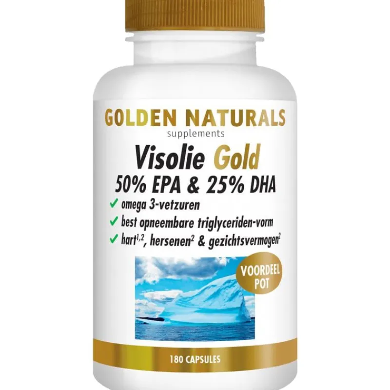 Visolie Gold 50% EPA & 25% DHA van Golden Naturals is een hooggedoseerd omega 3-supplement in de best opneembare triglyceriden-vorm. EPA en DHA zijn essentiële vetzuren die bijdragen aan een gezond hart, goed werkende hersenen en een scherp gezichtsvermogen.