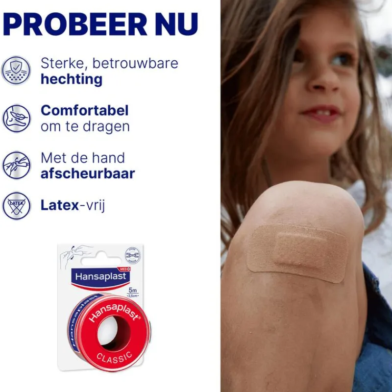 De Hansaplast Classic Hechtpleister 5 M x 2,5 CM zet verbanden en kompressen vast. De pleister heeft een sterke kleefkracht en kan met de hand worden afgescheurd. De hechtpleister is 5m x 2,5cm.