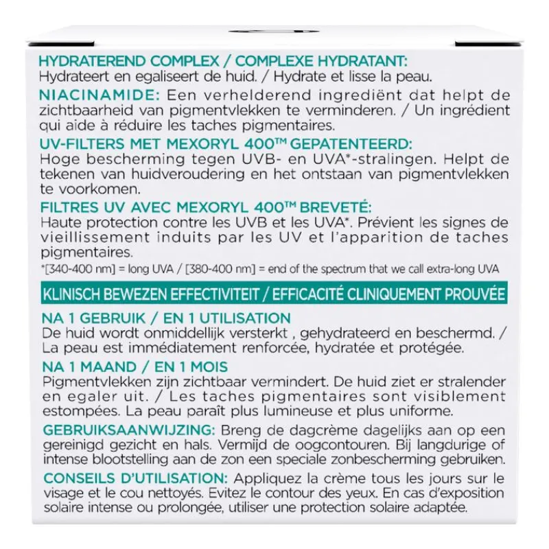 HYDRATEREND COMPLEX. Hydrateert en egaliseert de huid. NIACINAMIDE: Een verhelderend ingrediënt dat helpt de zichtbaarheid van pigmentvlekken te verminderen. Helpt de tekenen van huidveroudering en het ontstaan van pigmentvlekken te voorkomen Breng de dagcrème dagelijks aan op een gereinigd gezicht en hals. Vermijd de oogcontouren. Bij langdurige of intense blootstelling aan de zon een speciale zonbescherming gebruiken. HYDRATEREND COMPLEX. Hydrateert en egaliseert de huid. NIACINAMIDE: Een verhelderend ingrediënt dat helpt de zichtbaarheid van pigmentvlekken te verminderen. Helpt de tekenen van huidveroudering en het ontstaan van pigmentvlekken te voorkomen