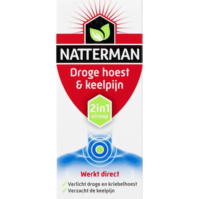 Natterman Droge hoest en Keelpijn 2in1 siroop met het actieve ingrediënt Polysac-ActiveTM voor de behandeling en preventie van droge hoest en verlichting van keelpijn. Polysac-ActiveTM, een op honing gebaseerd extract, creëert een beschermende filmlaag achter in de keel. Het verzachtende effect geeft snel een gevoel van verlichting van droge hoestsymptomen en keelpijn. De siroop beschermt de slijmvliezen tegen verdere irritatie. Door de keel te verzachten wordt de frequentie en ernst van de hoest verminderd en de hoestcyclus onderbroken.