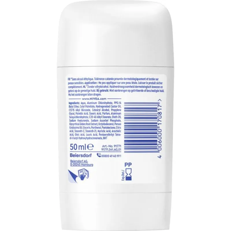 NIVEA Derma Control Defend Deodorant Stick biedt 72 uur* betrouwbare anti-transpirant bescherming en is speciaal ontwikkeld om de huid te beschermen tegen irritaties na het scheren. De formule met Pure Hyaluron en ProVitamine B5 beschermt je huid effectief tegen irritaties na het scheren en vermindert wrijving door kleding, terwijl het de huid van de oksels voedt. Deze deodorantstick bevat geen ethylalcohol en is daardoor mild voor de gevoelige huid. De huidverdraagzaamheid is dermatologisch getest, zodat je met een gerust hart kunt vertrouwen op langdurige zweet- en geurbescherming. Anti-irritatie en anti-bacterieel**. Kies voor een deodorant die niet alleen beschermt, maar ook actief bijdraagt aan het herstel en comfort van je huid. *Instrumentele test, 22 vrijwilligers **in-vitro test op bacteriën die geurtjes veroorzaken.
