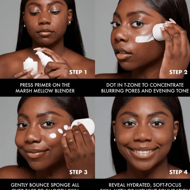 Breng een beetje product aan op je gezicht, verdeel met schone vingers of met een kwast voor je je foundation aanbrengt.Pro-tip: Gebruik de Marshmellow Blender sponge om de primer aan te brengen en in je huid te blenden voor een smooth canvas als basis voor je makeup.