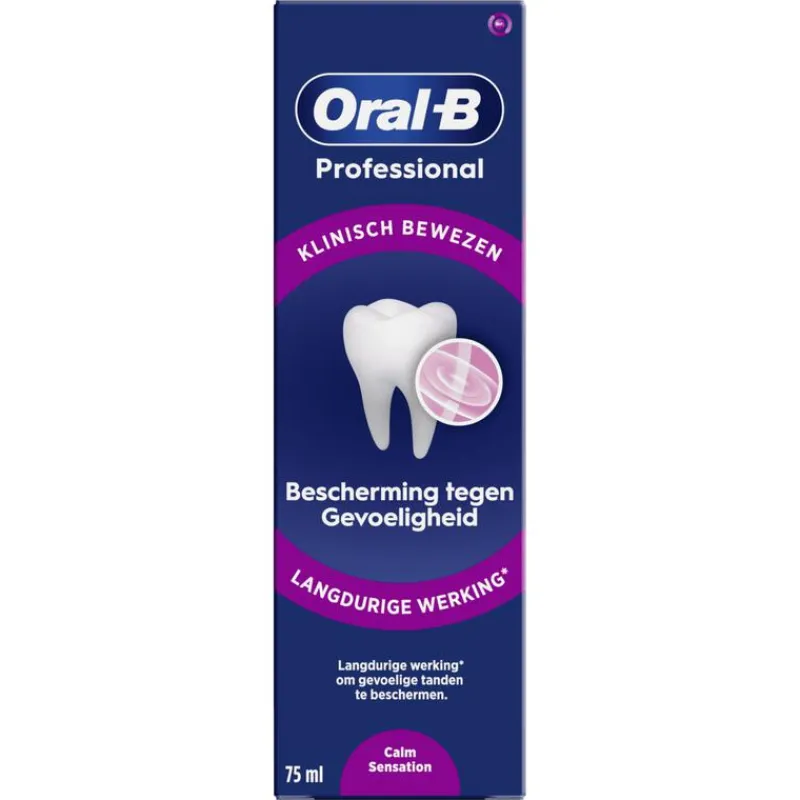 Oral-B Professional Bescherming Gevoelige Tanden Kalmerende Sensatie is klinisch bewezen: het biedt langdurige bescherming voor gevoelige tanden, bij voortdurend gebruik. De unieke antibacteriële technologie van Oral-B met tinfluoride-complex en actieve kalmerende bestanddelen creëert een beschermend schild om gevoelige tanden effectief te beschermen, zelfs tussen de poetsbeurten door, terwijl het een verkoelend gevoel geeft tijdens en na het poetsen. Geschikt voor gevoelige tanden. Dagelijkse tandpasta.