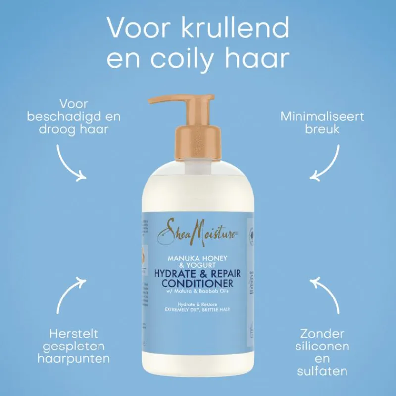 SheaMoisture Manuka Honey & Yoghurt Hydrate & Repair Conditioner herstelt droog en beschadigd haar. De conditioner helpt beschadigd haar en gespleten haarpunten te herstellen, waardoor je haar weer gezonder aanvoelt. De herstellende conditioner vermindert haarbreuk op warmte-gestyled haar met 76% wanneer gebruikt met onze Hydrate & Repair Shampoo*. Wanneer je deze conditioner regelmatig gebruikt, wordt je haar veerkrachtiger, sterker en gaat het weer glanzen. De SheaMoisture Manuka Honey & Yoghurt Hydrate & Repair Conditioner is verrijkt met een voedende mix van manukahoning, yoghurt, natuurlijke sheaboter en mafura- en baobabolie. Dit product is geschikt voor dagelijks gebruik, bevat geen siliconen en sulfaten en is ook geschikt voor gekleurd haar. *Getest op niet-chemisch behandeld haar.