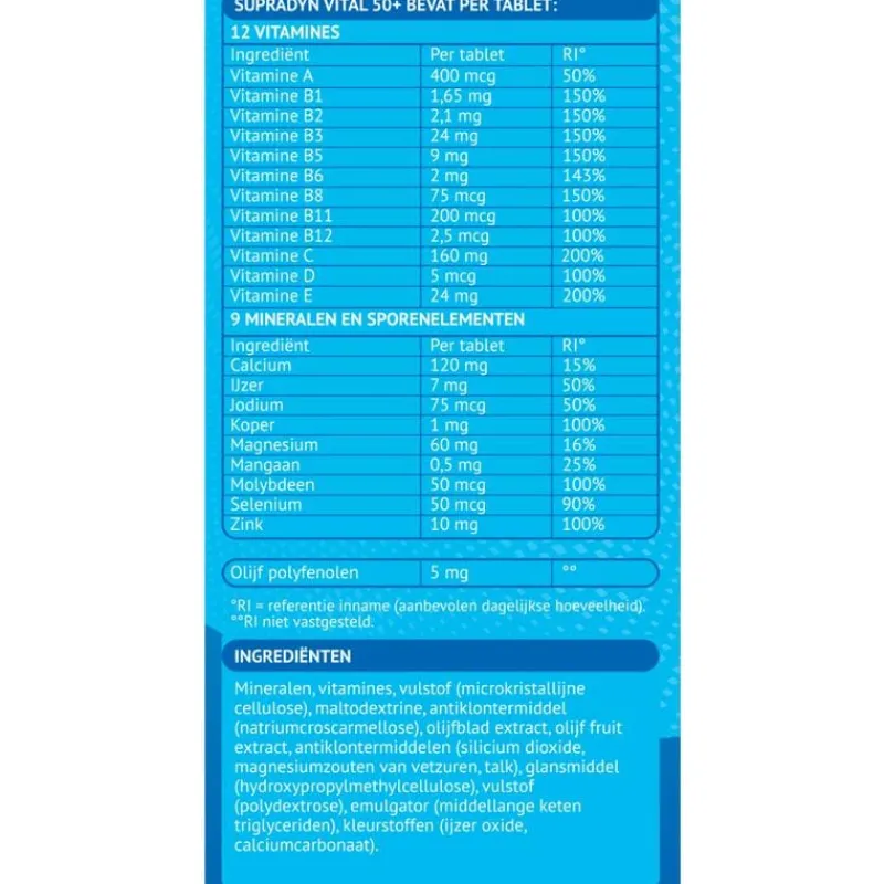 Supradyn Vital 50+ bevat een combinatie van vitamines die voorzien in de veranderende behoefte van je lichaam vanaf 50 jaar. De vitamines B1, B2, B3, B5, B6, B8, B12, C, het mineraal magnesium en het sporenelement ijzer ondersteunen je energieniveau en houden je vitaal. De mineralen ijzer, jodium en zink zijn goed voor het geheugen en behoud van een heldere geest. ; Essentiële vitamines en mineralen spelen een belangrijke rol bij de energiestofwisseling. Supradyn Vital 50+ ondersteunt je energieniveau* en helpt je om geestelijk** en lichamelijk* vitaal te blijven. *De vitamines B1, B2, B3, B5, B6, B8, B12, C, het mineraal magnesium en het sporenelement ijzer ondersteunen je energieniveau en houden je vitaal zodat je de dingen kunt blijven doen die je graag doet. ; **De mineralen ijzer, jodium en zink zijn goed voor het geheugen en behoud van een heldere geest.