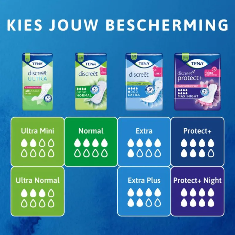 TENA Discreet Ultra Normal biedt discrete en veilige bescherming voor licht tot matig urineverlies. Het zachte verband is ontworpen voor vrouwen met een gevoelige blaas en biedt een opmerkelijk absorptievermogen. Dankzij de drievoudige bescherming worden lekken, geurtjes en vocht effectief tegengehouden, zodat je tot 12 uur lang droog blijft. TENA Discreet Ultra Normal is ideaal voor die onvoorspelbare druppels, zodat je kunt vertrouwen op de veiligheid die je nodig hebt en de discretie die je wilt.