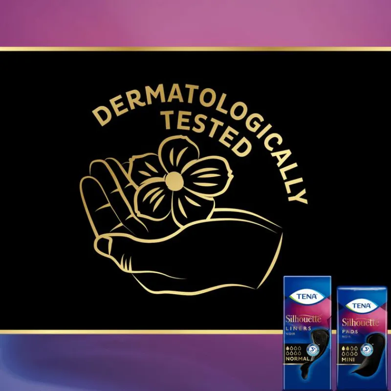 TENA Silhouette Noir Mini incontinentieverband is speciaal ontwikkeld voor zwart ondergoed voor een optimale discretie bij licht urineverlies. Of u nu in de sportschool bent om u om te kleden of thuis in uw slaapkamer, met TENA Silhouette-incontinentieverband kleedt u zich vol vertrouwen uit. Het is dun en zwart om perfect bij uw zwarte ondergoed te passen – u merkt niet eens dat u iets draagt. TENA Silhouette Noir Mini biedt drievoudige bescherming tegen doorlekken, geurtjes en een vochtig gevoel, om ervoor te zorgen dat druppels en licht urineverlies diep worden ingesloten in het verband. Het is dermatologisch getest en vrij van parfum. Onzichtbaar in uw ondergoed. Beschermt als TENA.