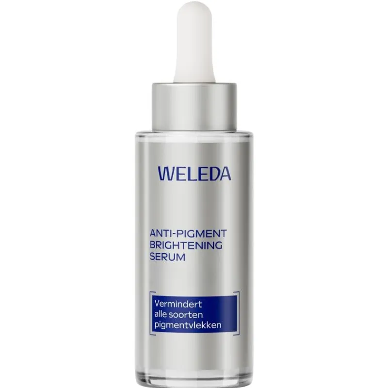Met de leeftijd kan de huid volume verliezen en kunnen pigmentvlekken, rimpels en lijntjes ontstaan. WELEDA Anti-Pigment Brightening Serum is een krachtig anti-age serum dat zichtbaar alle soorten pigmentvlekken vermindert, het collageengehalte van de huid verhoogt en zorgt voor een direct steviger huidgevoel. Dit 100% natuurlijke en biologische serum is speciaal ontwikkeld voor de 50+ huid en de huid vanaf de menopauze met pigmentvlekken en collageenverlies. De fluweelzachte lotiontextuur voedt en hydrateert de huid onmiddellijk en ondersteunt de huid bij het verminderen van diepe rimpels en het verbeteren van de gezichtscontouren. Het resultaat is een egale, heldere en stralende teint. Dermatologisch getest en vegan.