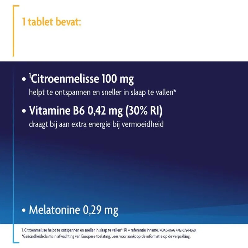ʹCitroenmelisse 100mg: helpt te ontspannen en sneller in slaap te vallen.* Vitamine B6: 0,42 mg (30% RI): draagt bij aan extra energie bij vermoeidheid. *Gezondheidsclaim in afwachting van Europese toelating.