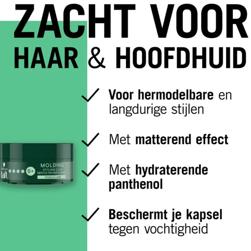 Wil je er verzekerd van zijn dat je haar de hele dag flexibel in model blijft? De Taft Molding Clay is de oplossing! Een fijne klei die je kapsel een mooie matte finish geeft en gemakkelijk is aan te brengen. Het geeft ook extra textuur aan wat dunner haar. Het voordeel van het gebruik van een klei is dat het je haar flexibel houdt en je daardoor gemakkelijk gedurende de dag je haar kunt re-stylen. Een klei is een wat drogere formule en daarom voornamelijk geschikt voor korter haar.