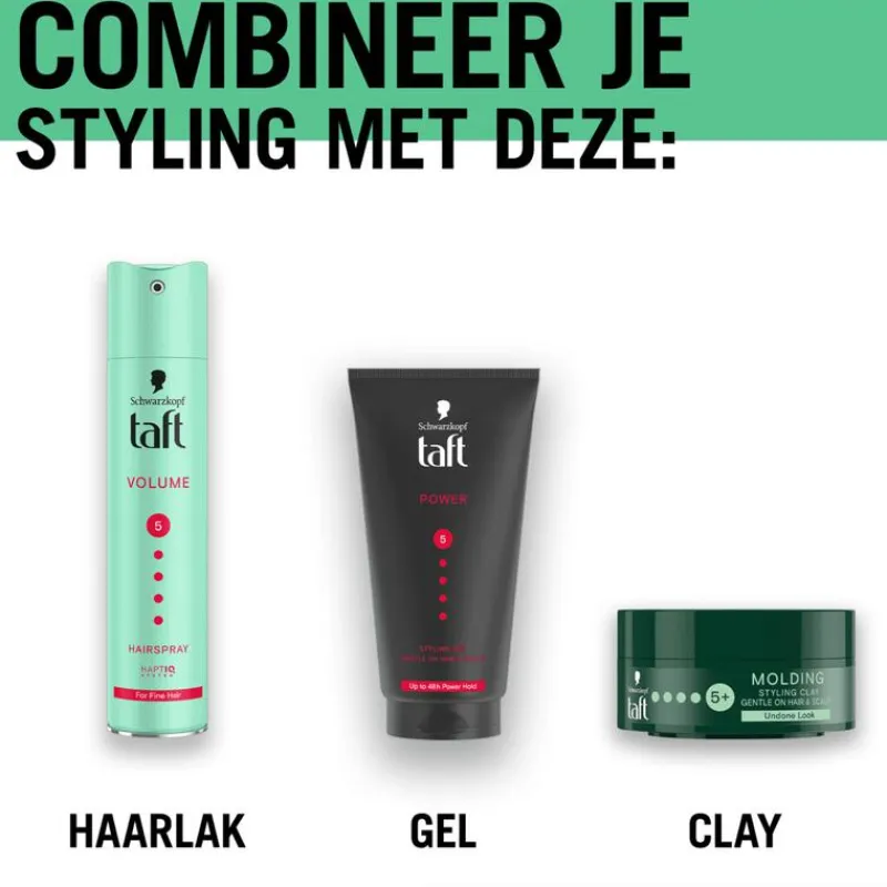 - Voor extra hold gedurende dag combineer je de clay met de Taft Power Invisible Haarspray